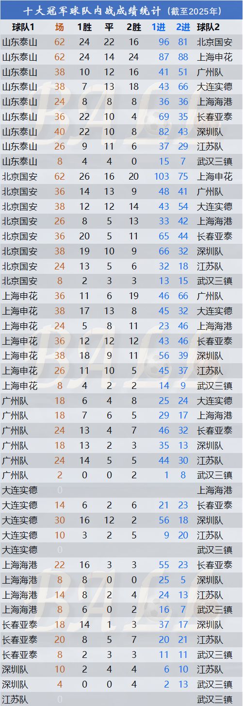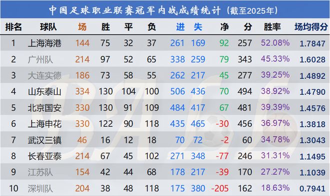 上海海港与历代冠军球队,甚至是与大连、广州两大王朝球队相比,上海海港的顶级联赛之路无疑要顺畅得多。该队升级后前两个赛季分别获得第9和第5名,其他赛季全部位居前四。除了早年遭遇过广州队的压制,海港队基本就没有体验过逆境。他们以场均得1.78分高居第一,与第二名广州队的差距,在相邻球队的分差中,仅次于最弱的深圳队与倒数第二江苏队的差距。此外,海港队胜率最高,超过第二名广州队接近7个百分点;净胜球也是最多。在与其他冠军球队的历史对战成绩方面,除了与大连实德没有交集,上海海港与剩余8支球队都有过交锋。对广州队处于下风,与泰山队难分轩轾,在面对剩余6队时,全面占据上风。广州队许多人对广州队的印象基本停留在恒大时期。在恒大之前,广州队也在顶级联赛摸爬滚打过7个赛季,在中超的最后一个赛季,也成了人见人欺的弱旅,这些都属于该队历史的一部分。这让广州队在这个榜单上的数据没有2010年代9年8冠想象中那么强势。尽管如此,除了面对大连实德、北京国安以及武汉三镇处于下风,广州队在对阵其他6队时都占据优势。大连实德由于过早退出职业联赛,大连实德最巅峰的时期,与后来的两大王朝级球队广州恒大、上海海港完全错开,与海港队甚至连照面都没打过。与广州队类似,大连自最后一次夺冠至退出中超,有7个赛季实质上已经沦为没有竞争力的球队,这也大大拖累了他们的表现。在7个对手当中,山东泰山、深圳队这两个在大连王朝时期虎口拔牙的球队,被大连打得最惨;面对北京国安、广州队这两个非直接竞争者,仅有微弱优势。出乎意料的是,尽管在早年争冠中多次压制上海申花,与后者的直接交锋成绩却让二者看起来不像一个是级别的球队。在面对新兴势力江苏队、东北小弟长春亚泰时,大连也没有占到便宜。山东泰山泰山队在总积分榜上位列第一,力压甲A元年三老的另外两队北京国安和上海申花。在这个冠军内战榜中,他们依然对这两队保持领先。对北京队,泰山24胜22平16负,净胜球15个;对上海队,堪堪打平,净胜球-1。在三强内战中,这个成绩仍然排第一。面对三大王朝级球队,泰山队仅仅与海港队维持平手。倒是在与其他4支一冠球队的交锋中,占据了较为明显的优势。北京国安如果说在对山东队时处于下风,那么在对阵上海申花时,北京队可谓春风得意。尽管只是在对战中多了6场胜利,却攒下28个净胜球,这意味着抵消掉各自的胜负场次,北京队对申花多出来6场4+球的大胜。对于将目标专注于战胜死对头的球队而言,这个成绩不可谓不辉煌。对阵两大八冠王,北京也不落下风,在大连实德身上损失的净胜球,在广州队身上都赚回来了,还盈余3场胜利,试问泰山、申花和海港,你们做到了吗?[抠鼻]上海申花在这个榜单上,申花队多少有点尴尬。在三老内战中,尽管勉强赢了泰山一个净胜球,却抵不住对北京的大溃败;尽管胜场比负场多4场,净胜球却大亏30个,这说明在对阵排名靠后的弱势冠军们的时候,他们也没有找回足够的场子。但申花也不是完全没有亮点。至少在对阵老对手大连实德时,多出9场胜利,这不是谁都能做到的。鉴于申花克大连,北京大胜申花,却让大部分的冠军被其他球队拿走,难免有人调侃是不是这两队将眼光过于局限在死对头身上而忘记争冠大业了。武汉三镇如果只看武汉三镇作为后起之秀在榜单中还能领先于三支球队,就以为他们后生可畏,前途无量,可能就大错特错了。将他们的成绩剥离成两部分来看,就知道什么叫作高开低走。2022赛季,可以称为中超史上最不寻常的年份,四支升班马的名次分别是1、3、5、9,这让多少强迫症患者幻想如果有5支升班马的话,岂不是将前十名的奇数位都占完了。武汉三镇实现了中超史上第二次升班马夺冠的壮举,而升班马集团的整体强势,不但在中国联赛,放眼世界足坛也是罕见的奇迹。武汉三镇有机会在这一年中,面对这个榜单中的7支老冠军,14场交锋下来10胜3平1负,得失球38-13。根据总成绩,这就意味着在接下来的三年中,面对这些老牌球队,他们的成绩是6胜9平17负,得失球32-59(这个成绩跟该队本赛季倒数第三的联赛成绩无比接近),完全是一支保级球队的姿态。不过,无论是该队还是他们的球迷,应该都不会有闲暇关注我们在这里评头论足,明年继续出现在中超赛场,就是最大的胜利。长春亚泰、江苏队、深圳队虽然排名靠后,长春亚泰还是有垫背的球队,让自己看起来不那么难堪。他们面对深圳队取得14胜1平3负的绝对优势,在与大连实德和上海申花的交锋中也不落下风,这已经很不容易了。像排名一样,亚泰队还需要努力的是,避免自己落入身后两支球队的结局。虽然场次很少,但江苏队也能在与大连实德和深圳队的交锋中占据优势,这与他们的排名相比,已经是个胜利。至于深圳队,一个悲催的事实是,他们不但各项数据在榜单中垫底,甚至在与其他9支球队的交手中,全部处于弱势,连“惜败”都算不上。后序球迷间由于立场不同,有争吵实属正常。只要是技术性探讨,争论都是被支持的。在此呼吁,不要有人身攻击,不要将球队拟人化进行攻击。中国足球职业化这么多年,种种问题层出不穷,仍然受到高度关注,说明大家心里还没有彻底将它放弃。如果某支球队有过一些黑点就要将其钉上道德的十字架,请大家扪心自问,你的主队经得起别人的审判吗?[狗头]