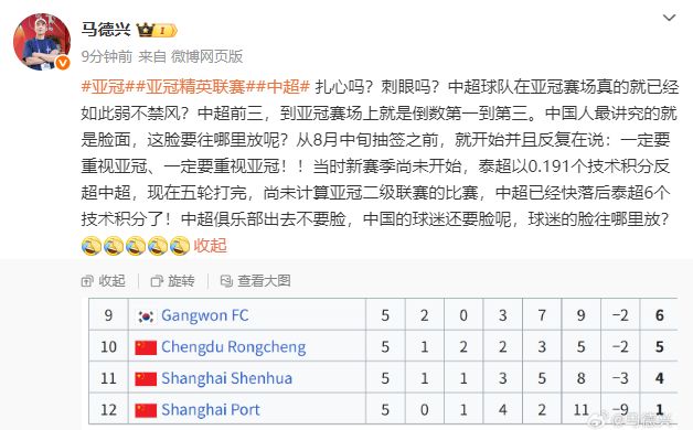 前5轮之后,三支中超球队在亚冠精英联赛东亚区排名后三位,其中,成都蓉城以5分排名第10位,申花、海港分别以4分、1分排名第11、第12位。上海海港不仅以1分垫底,而且是本赛季唯一一支尚未取胜的东亚球队。马德兴愤怒表示,“ 扎心吗?刺眼吗?中超球队在亚冠赛场真的就已经如此弱不禁风?中超前三,到亚冠赛场上就是倒数第一到第三。中国人最讲究的就是脸面,这脸要往哪里放呢?”